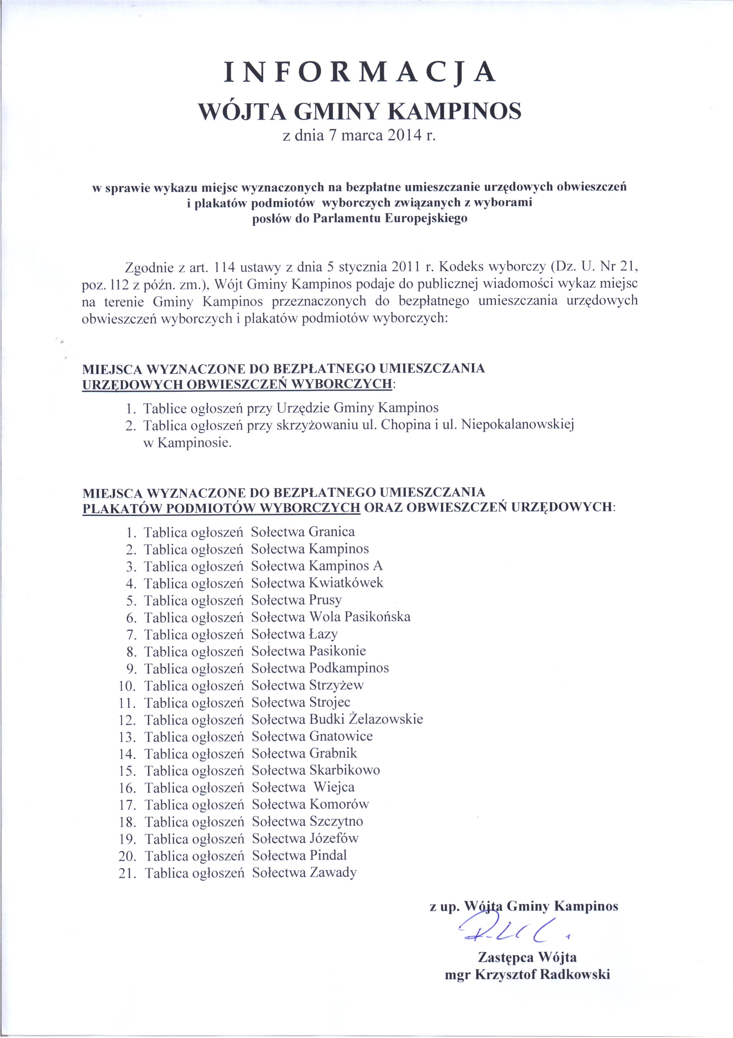 Obwodowa Komisja Wyborcza Nr 1 w Kampinosie informuje, iż w dniu głosowania w wyborach do Parlamentu Europejskiego, tj. 25 maja 2014 r. rozpoczyna pracę w lokalu wyborczym o godz. 6.00.